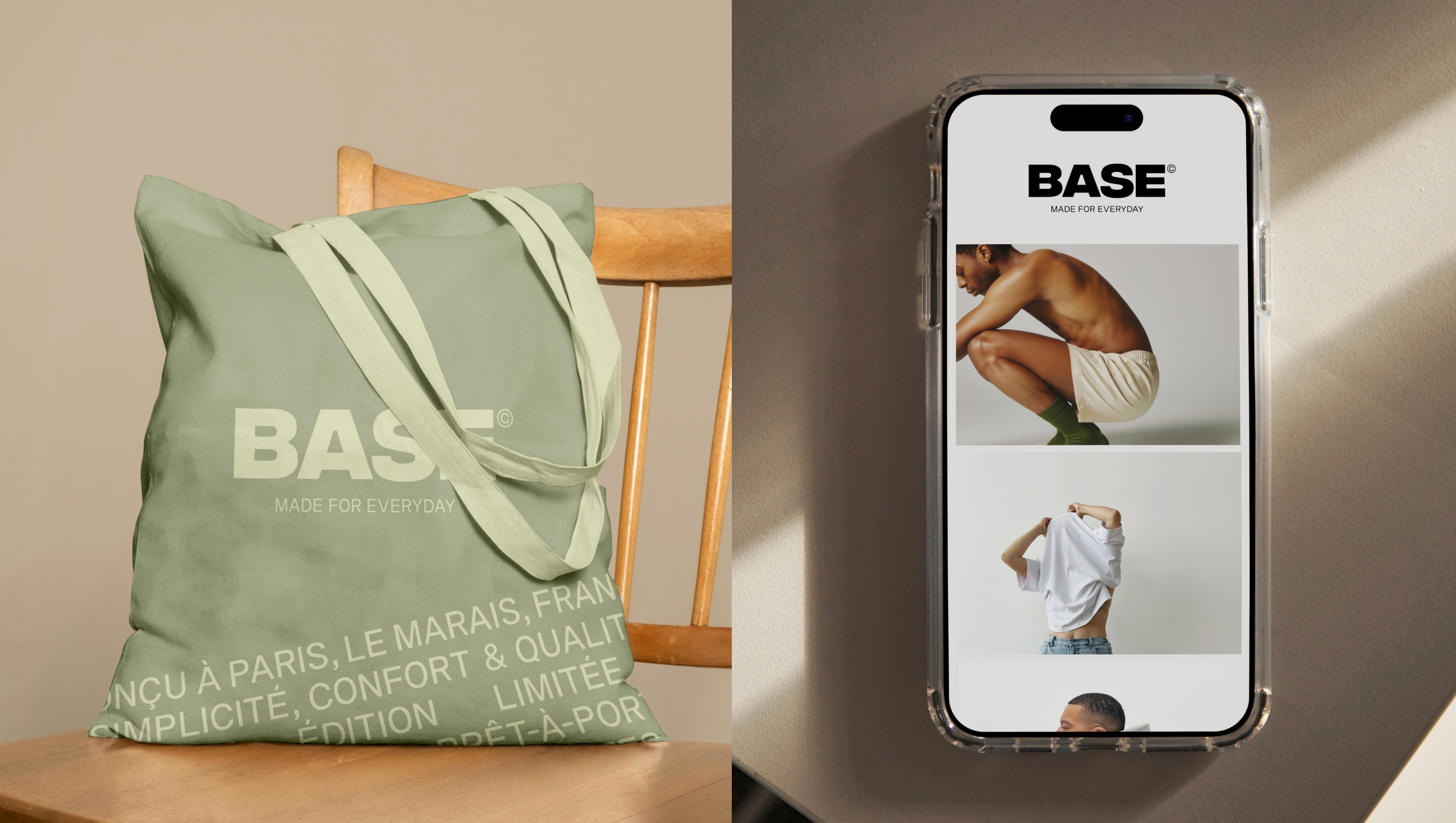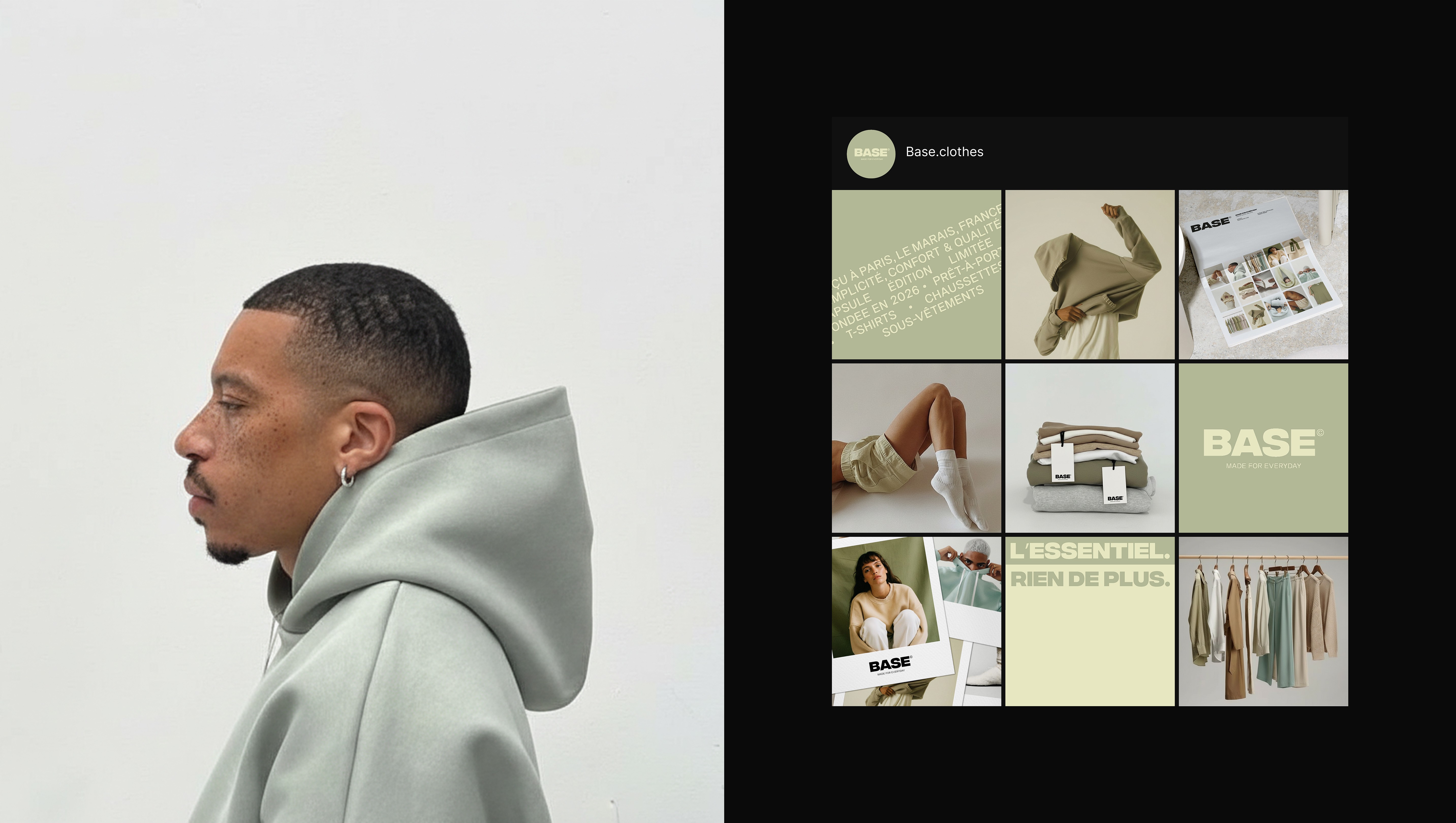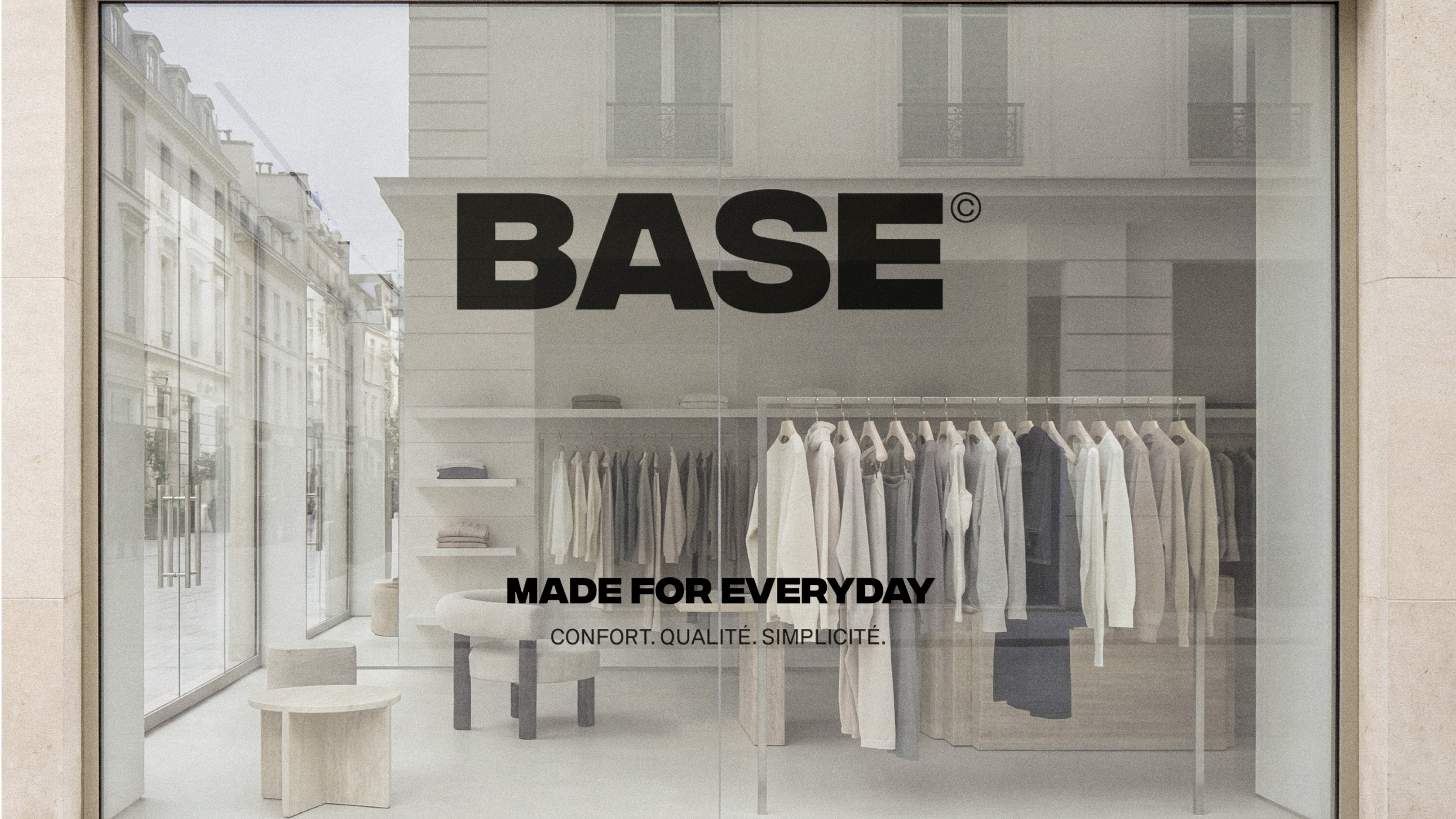 Dans un marché lifestyle saturé d’esthétiques complexes et de discours omniprésents, le défi consistait à concevoir une identité immédiatement lisible, capable d’évoquer le confort et la qualité sans recourir aux codes publicitaires classiques du vêtement. Il s’agissait de positionner BASE entre minimalisme contemporain et sensibilité premium, en créant une marque qui s’impose par sa justesse.