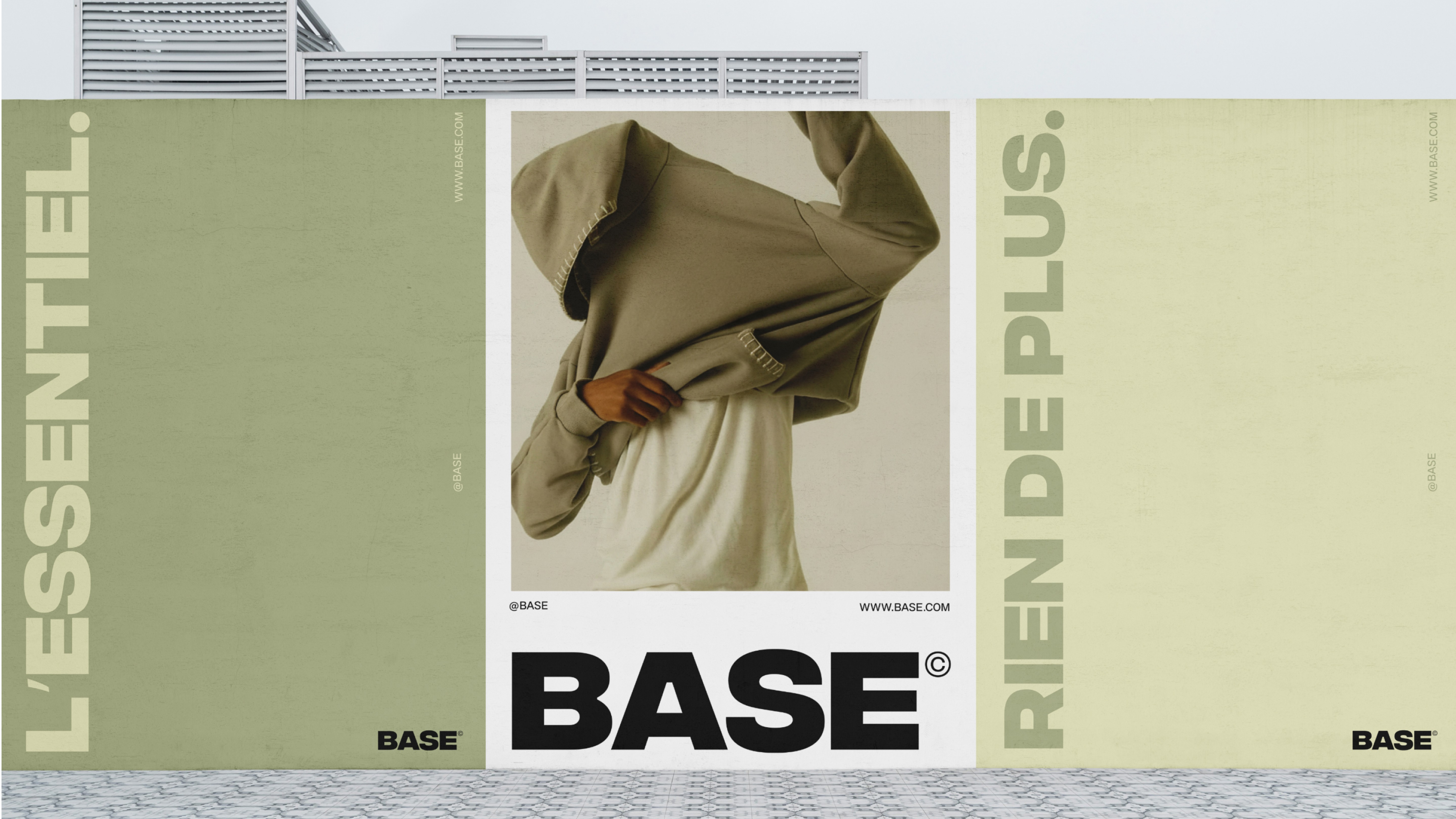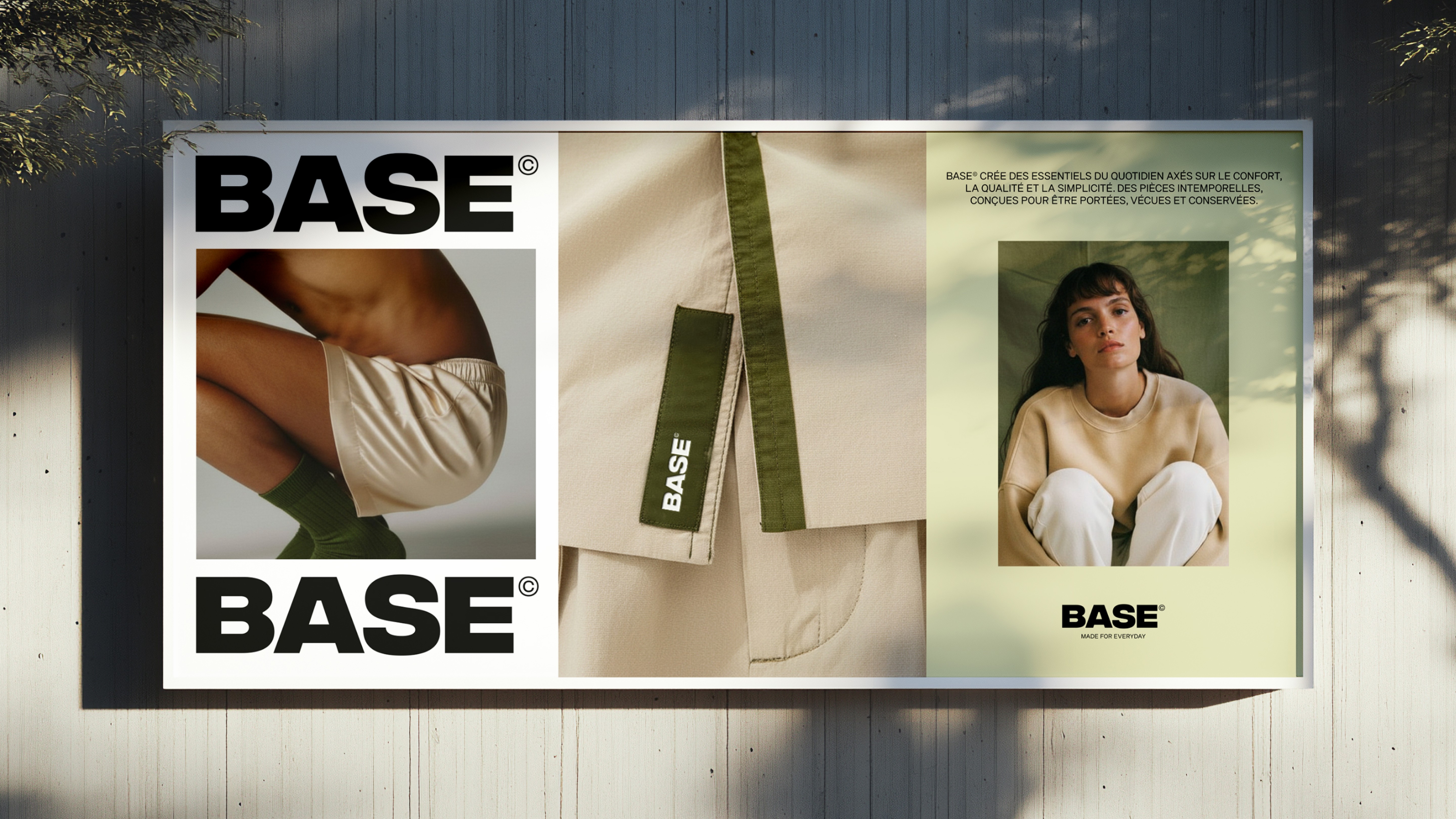 BASE s’adresse à une génération sensible aux matières, à la durabilité et à la discrétion esthétique. La direction artistique repose sur un principe central : faire moins, mais faire juste. Chaque choix graphique est guidé par la nécessité plutôt que par l’ornement. Les compositions sont aérées, les hiérarchies typographiques nettes, laissant respirer l’information. La palette, douce et naturelle, évoque la matière, la proximité et le confort. La typographie devient l’ossature de l’identité : un logo typographique, des slogans assumés en grand format et un système éditorial inspiré des codes du luxe contemporain et de la culture design.