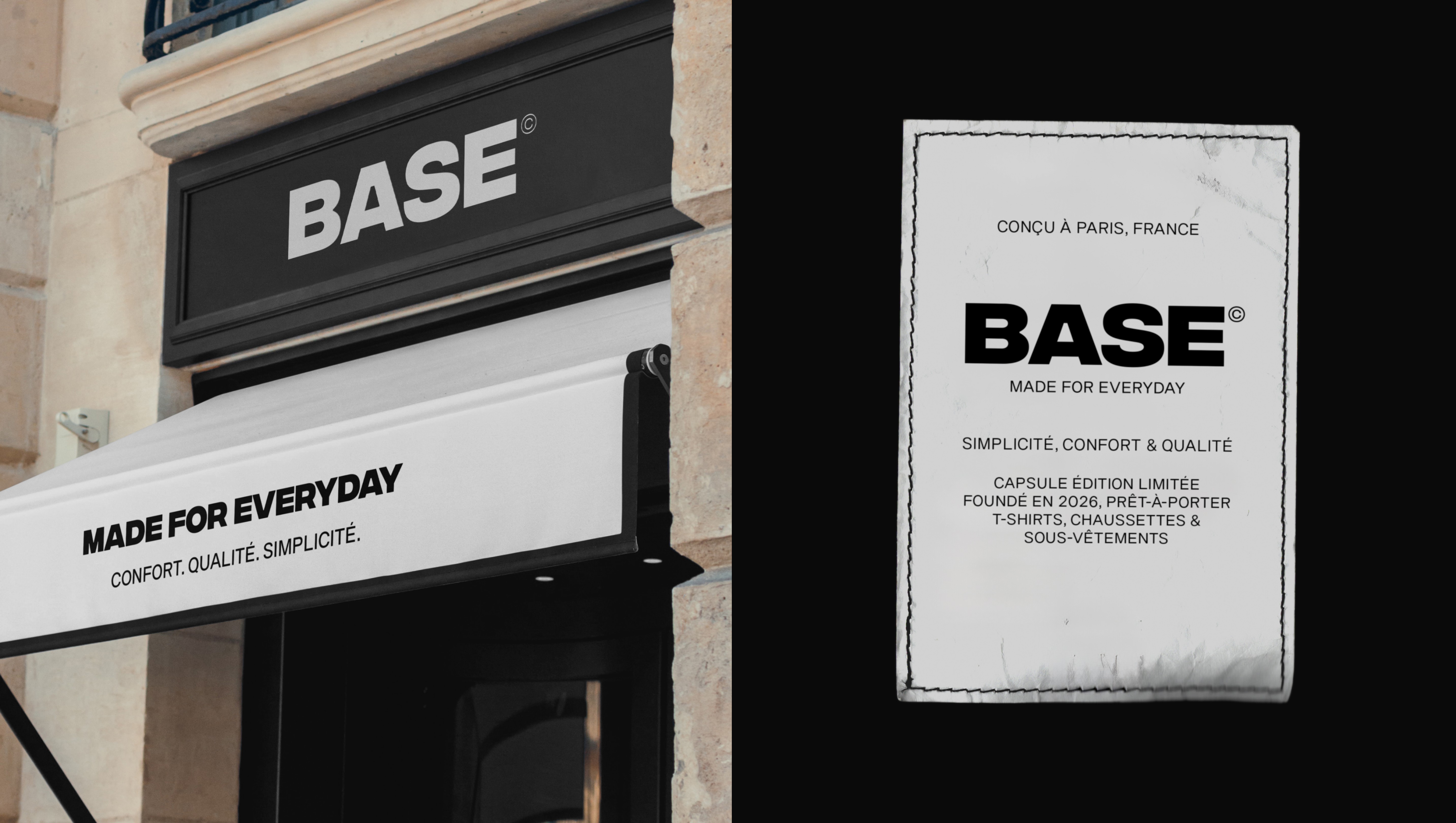 BASE est une marque de vêtements du quotidien née d’une idée simple : revenir à l’essentiel. Créer des pièces confortables, durables et intemporelles, pensées pour accompagner les gestes ordinaires de la vie sans artifice ni excès. Le projet interroge la manière dont une philosophie de sobriété peut se traduire en une identité visuelle forte, capable d’exprimer qualité, modernité et exigence à travers un langage graphique maîtrisé.